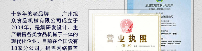 廣州旭眾食品機械有限公司是一家集科研開發,生產設計,營銷服務為一體的現代化生產企業。現代化生產車間,精湛制造技術,所產機械歷經市場重重考驗,不斷贏得海內外客戶的贊譽。