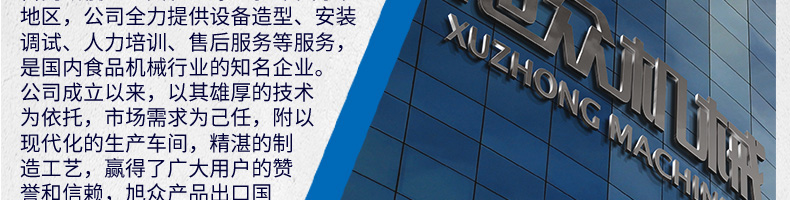 廣州旭眾食品機械有限公司是一家集科研開發(fā),生產(chǎn)設計,營銷服務為一體的現(xiàn)代化生產(chǎn)企業(yè)。現(xiàn)代化生產(chǎn)車間,精湛制造技術,所產(chǎn)機械歷經(jīng)市場重重考驗,不斷贏得海內外客戶的贊譽。
