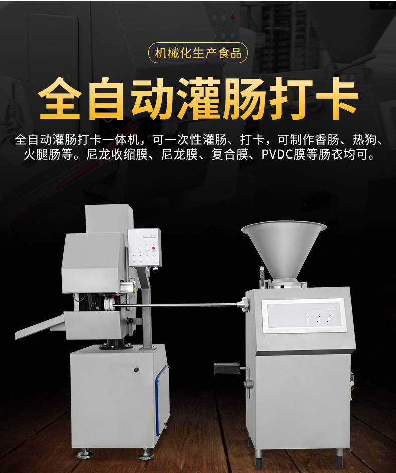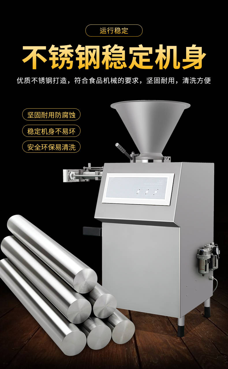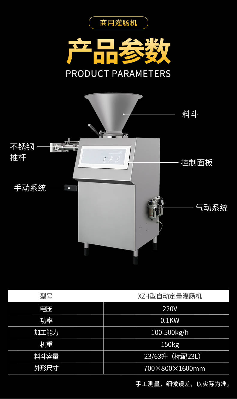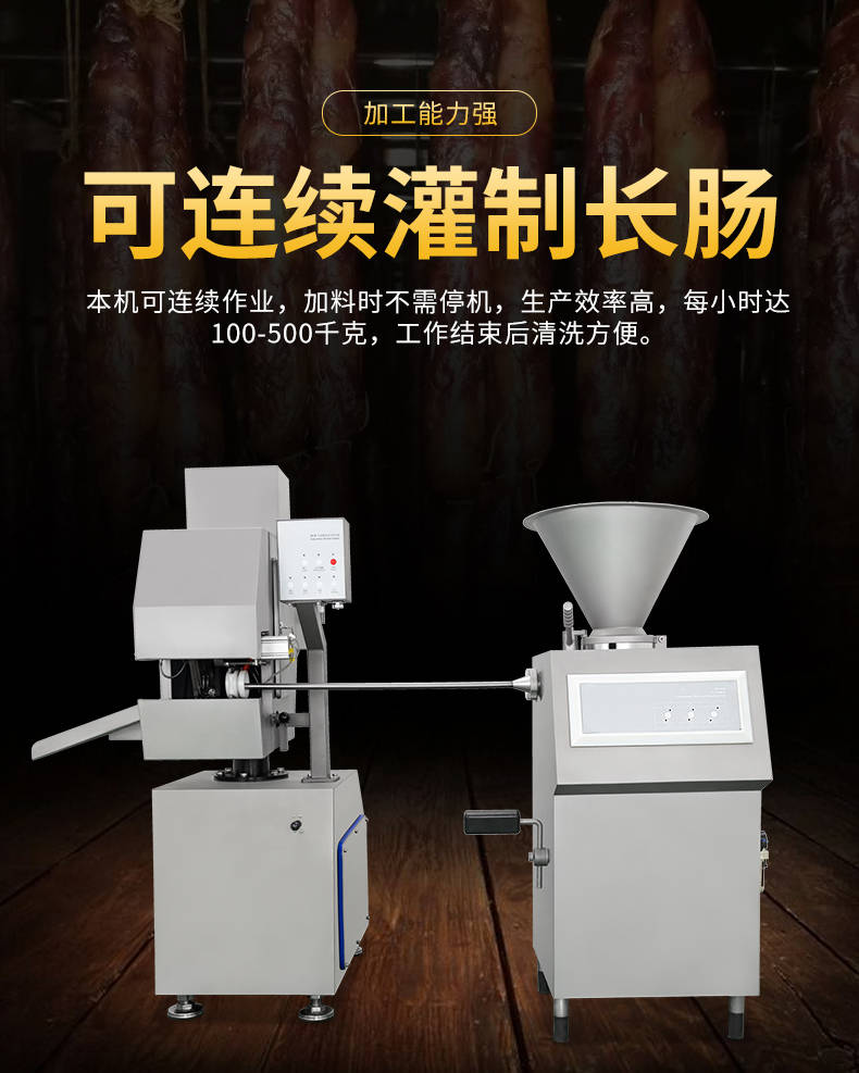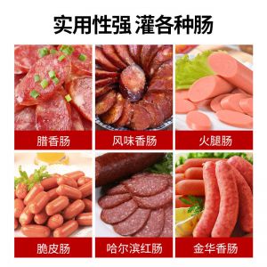 XZ-I型自動定量灌腸機,使用優質不銹鋼制造,符合食品機械的要求,只需1人操作,特別適合中小型肉食加工廠使用,以各種畜禽類肉糜為原料的香腸、火腿腸、熱狗等天然腸衣、蛋白腸衣、煙熏腸衣等制品,可以灌制定重量單腸,也可連續灌制長腸。
