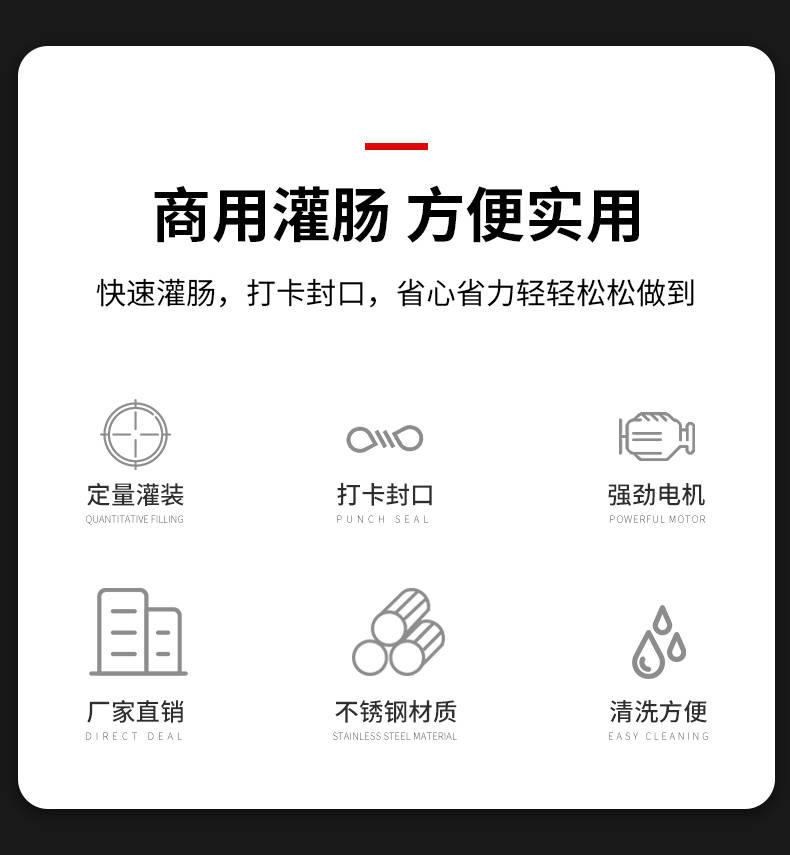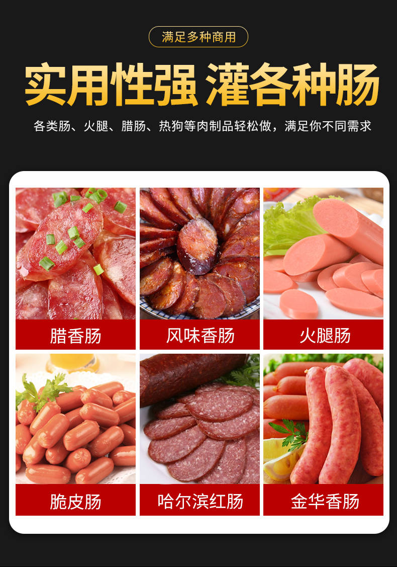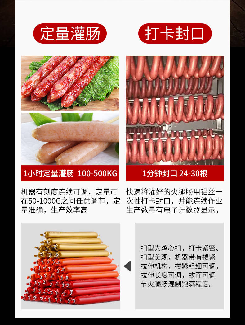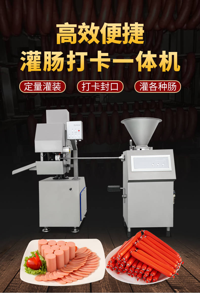 XZ-I型自動定量灌腸機,使用優質不銹鋼制造,符合食品機械的要求,只需1人操作,特別適合中小型肉食加工廠使用,以各種畜禽類肉糜為原料的香腸、火腿腸、熱狗等天然腸衣、蛋白腸衣、煙熏腸衣等制品,可以灌制定重量單腸,也可連續灌制長腸。