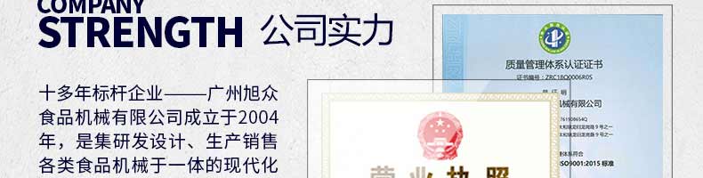 廣州旭眾食品機械有限公司是一家集科研開發,生產設計,營銷服務為一體的現代化生產企業。現代化生產車間,精湛制造技術,所產機械歷經市場重重考驗,不斷贏得海內外客戶的贊譽。