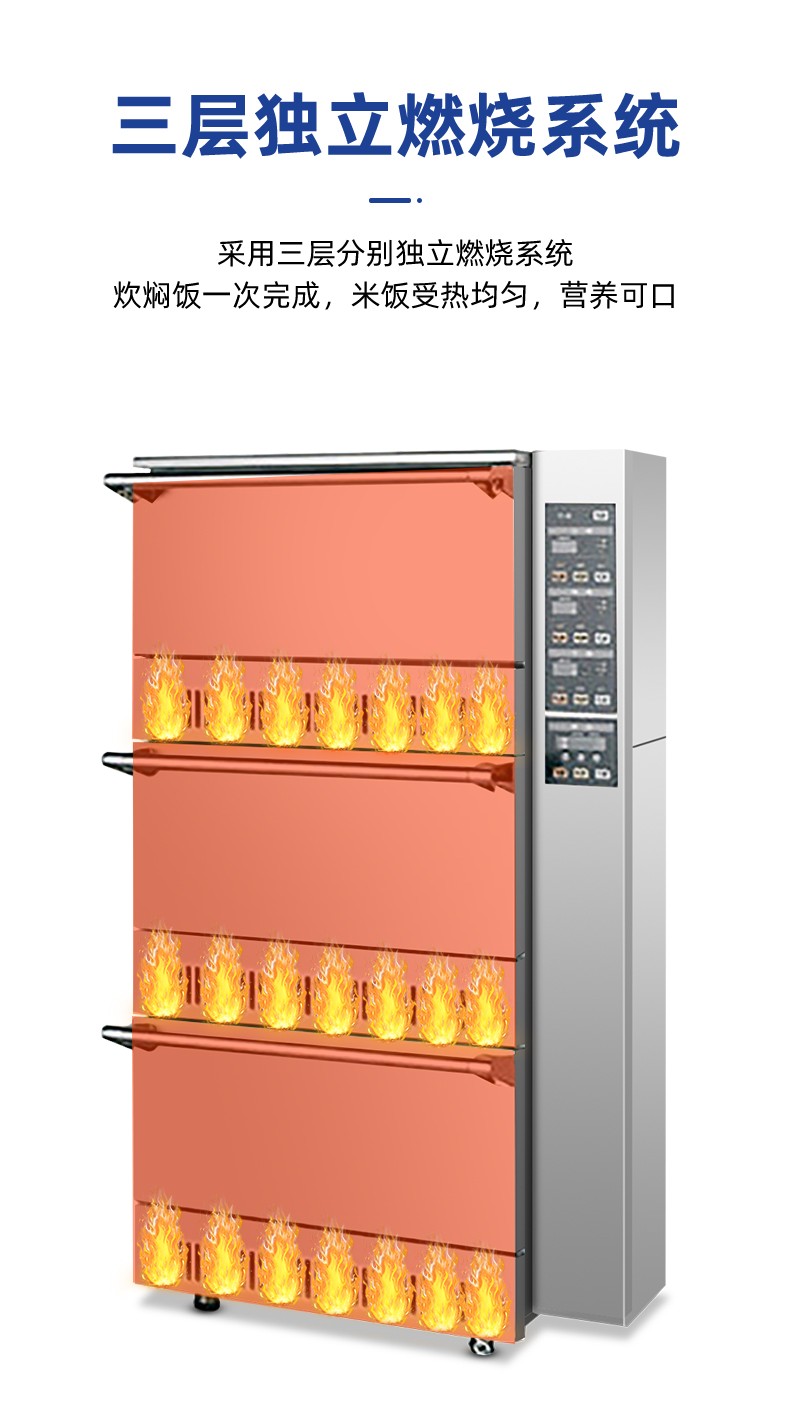 立式米飯機,主要結構:主要由全不銹鋼柜體、上下三層結構加原鋁鎂合金模鑄鍋體、微電腦自動控制系統燃燒系統、熄火保護系統等組成。適用對象:主要用于生產加工高品質米飯的壽司店、高端酒店西餐廚房、茶餐廳以及高端的快餐門店等