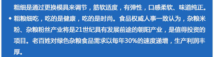 SZ-400多功能米粉機,生產多樣性可生產米粉、米線、粉絲、粉條、、年糕、玉米面條、各種雜糧粉絲、各種面條、雜糧面條、彩色面條以及以紅薯、玉米、大豆、蠶豆等制成淀粉為原料的等多種食品而且每種食品厚薄、粗細等規格可根據需要任意調整。
