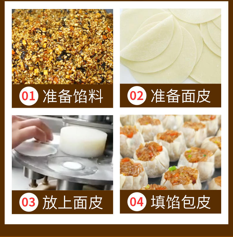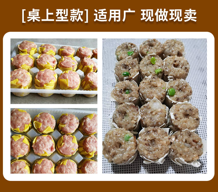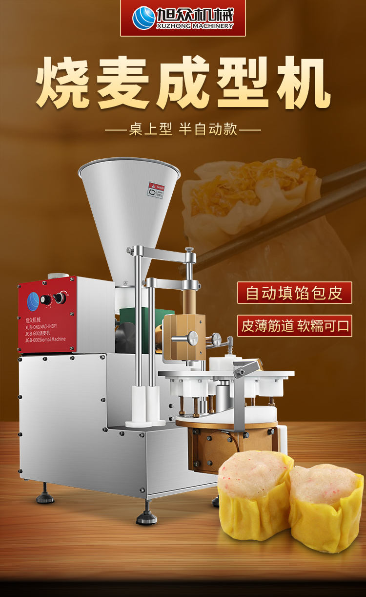 JGB-600燒麥機(jī),自動(dòng)填餡包皮功能:臺(tái)式半自動(dòng)單聯(lián)式燒麥成型機(jī),可以使用手工燒麥皮配合機(jī)器生產(chǎn)燒賣(mài),其面皮口感好,產(chǎn)品外形美觀。餡料多與少可調(diào)節(jié)高效率1800個(gè)小時(shí)