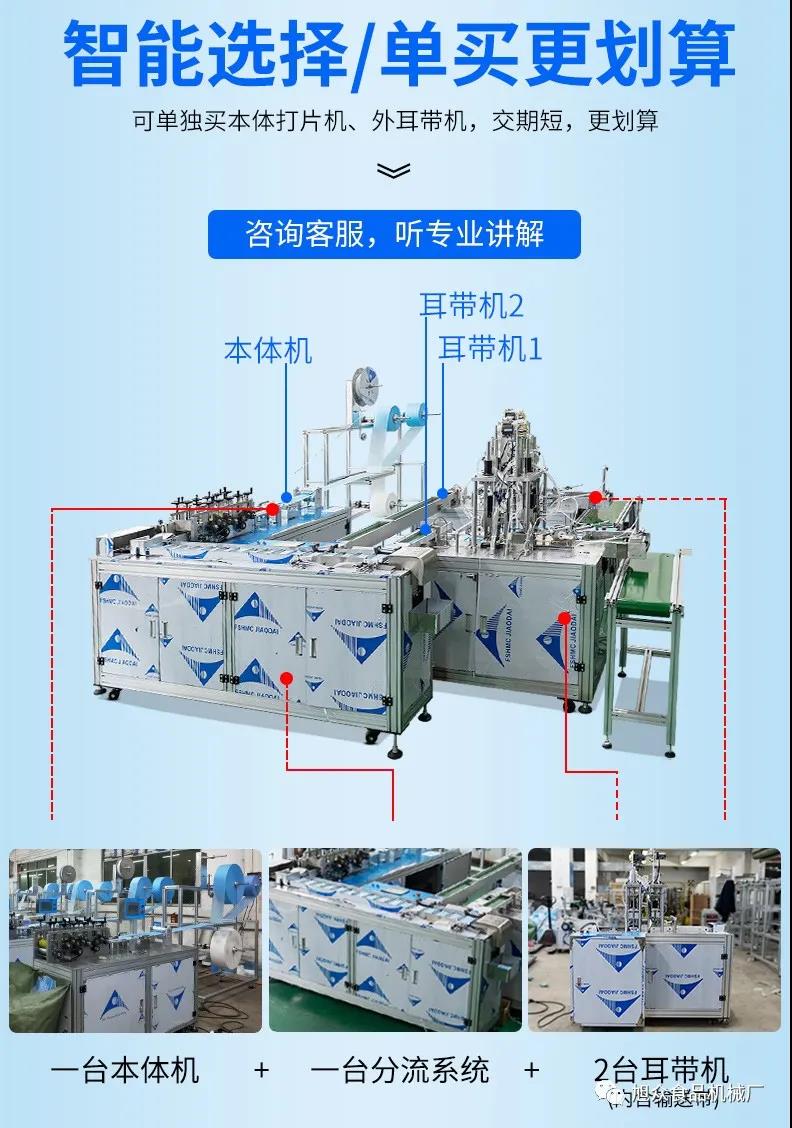旭眾牌一拖二口罩機由一臺本體機帶動兩臺耳帶機組成。本體機輸出ロ罩本體后,由輸送帶結構將口罩本體片輸送到連接耳帶機的輸送帶上,再通過輸送帶將口罩片輸送到耳帶機的正面第一個口罩盤上方,最后通過氣缸下壓把口罩片放置到耳帶機的口罩盤內,后續由耳帶機完成口罩的耳帶熔接,包邊等動作,從而完成一個耳帶口罩產品的生產。本機采用PLC、觸摸屏控制、主傳送帶采用單相馬達輸送、步進馬達翻轉,傳動精確,控制穩定,速度可調。